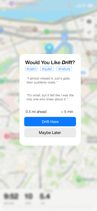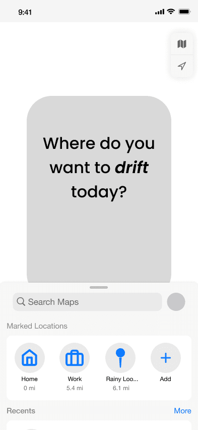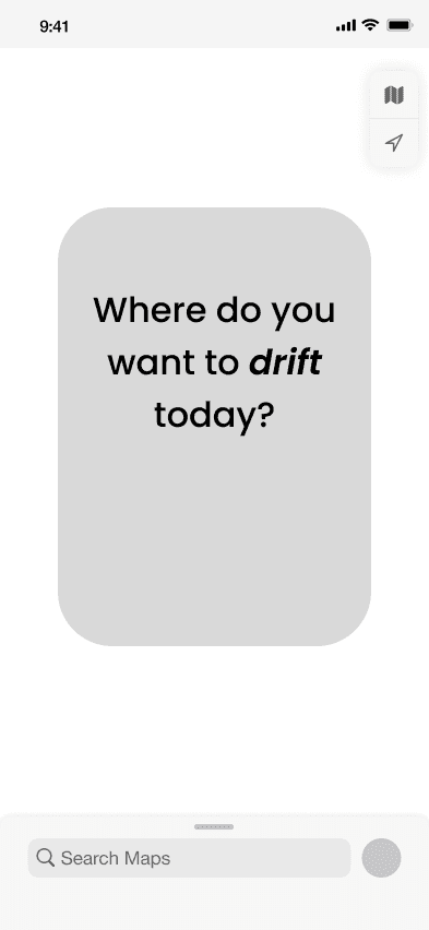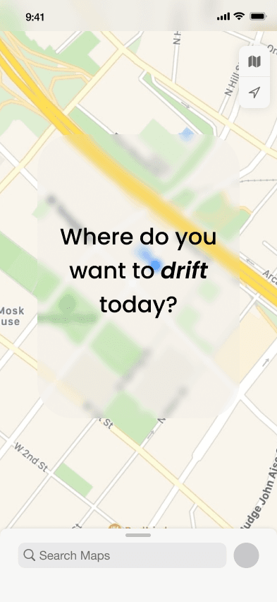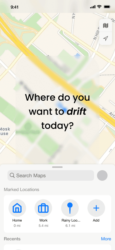 Drift is a conceptual Apple Maps extension that reimagines navigation as an emotional experience. Designed for users who explore based on mood rather than efficiency, Drift introduces a “Drift Mode” that offers vibe-based detours without disrupting the user’s route. I led the end-to-end design, from research to prototype, focusing on ambient UX, emotional tagging, and soft discovery. The result is a system that turns wandering into something intentional, restorative, and intuitively guided.