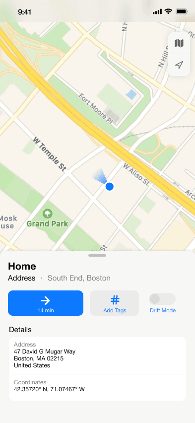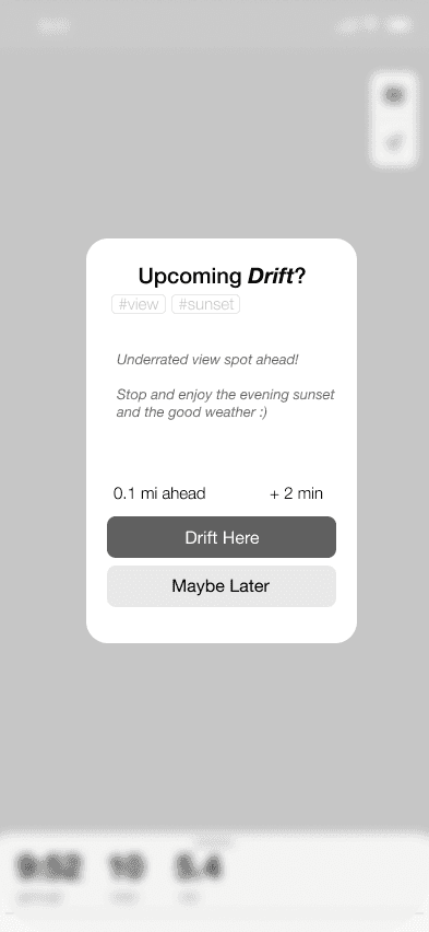 Drift Mode: Explore freely with ambient prompts that suggest stops 1–3 minutes ahead, without disrupting your destination