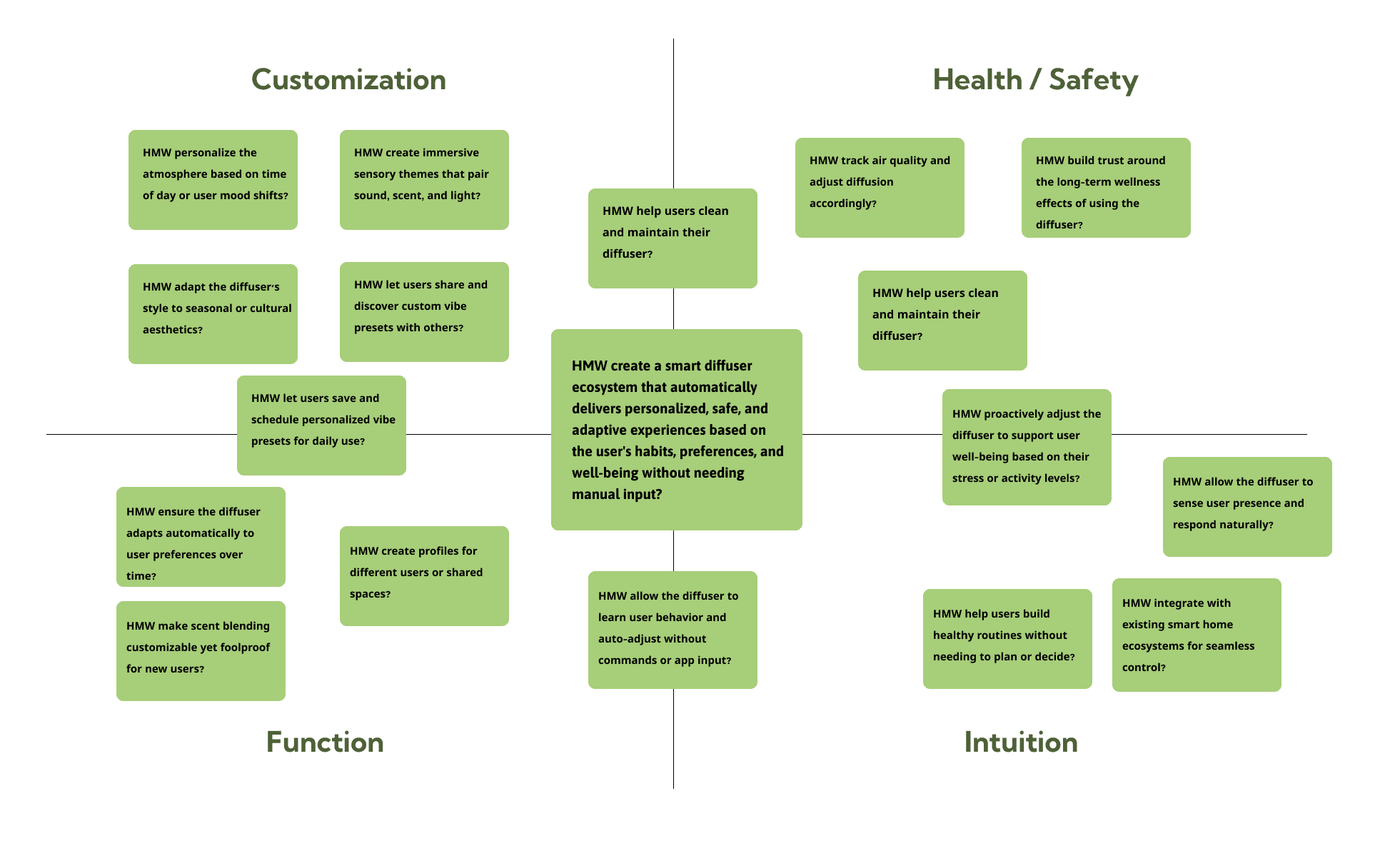 To ground our ideation, we synthesized user patterns into an interpret matrix that explored key contrasts such as mood vs. function and active vs. passive engagement. This helped define behavioral spectrums and where Fuse could intervene.